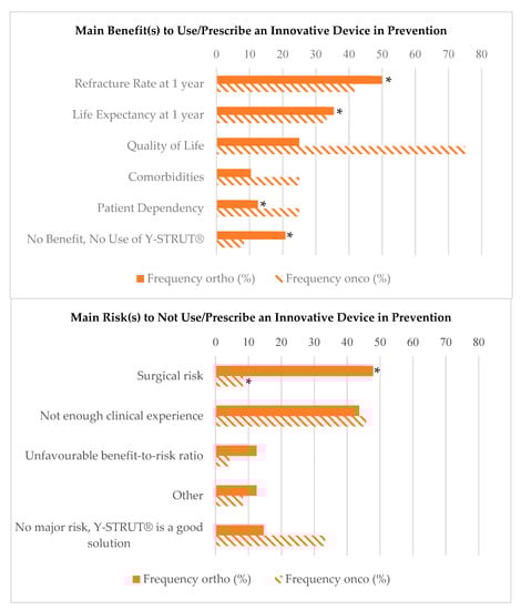 Finally, most of the experts would be willing to use or prescribe an innovative device in prevention in both indications and especially for cancer patients (63% in orthopedics-traumatology, 93% in oncology, p < 0.05). Among the benefits for using an innovative device, such as Y-STRUT®, the doctors highlighted the need for a low re-fracture rate and high life expectancy at 1 year, as well as quality of life, but they also agreed on the major risks of such device (more than 50% in each indication: 54% orthopedics-traumatology, 58% oncology), which include the limited clinical experience and the associated surgical risk (around 30% in each indication). It should be noted that, for the benefits, the re-fracture rate at 1 year was significantly different between responders of the orthopedics questionnaire compared and the responders interested in both indications (50% vs. 80%), as well as for life expectancy at 1 year (35% vs. 58%), patient dependency (12.5% vs. 31%), and no benefit/no use (21% vs. 0%); however, there were no significant differences in the oncologic indication for the benefits. Only the surgical risk was significantly different between responders of the orthopedics questionnaire compared to both indications (48% vs. 29%) and between responders of the oncologic questionnaire compared to both indications (8% vs. 34.5%) (Figure 2).