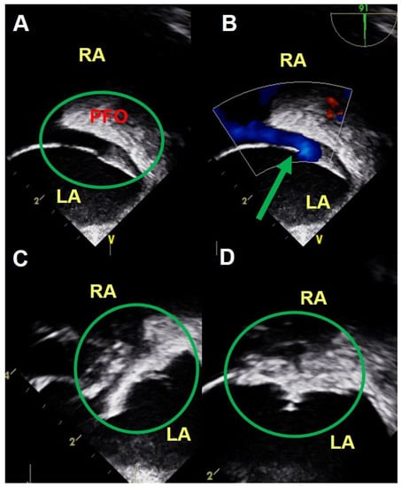 - Moon, J.; Kim, M.; Oh, P.C.; Shin, D.H.; Park, H.M.; Jo, Y.Y.; Lee, J.S.; Kang, W.C. Residual Shunt after Patent Foramen Ovale Device Closure in Patients With Cryptogenic Stroke: Serial Bubble Contrast Transesophageal Echocardiography Data. J. Stroke. Cerebrovasc. Dis. 2019, 28, 347–353. [Google Scholar] [CrossRef] [PubMed]