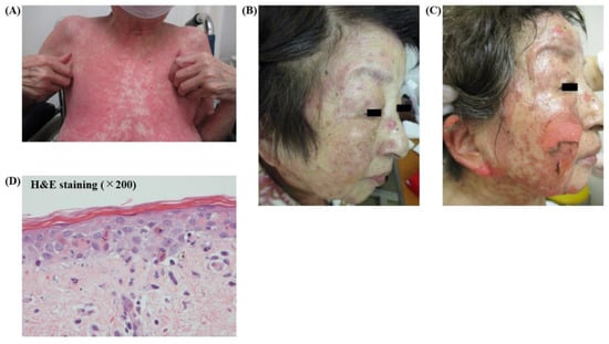 An 80-year-old woman with adenocarcinoma (cT4N0M1c [BRA, PUL], stage VIB) and harboring an EGFR-sensitizing mutation (L858R) was treated with osimertinib in December 2018 as the first-line treatment, which led to a partial response with marked tumor shrinkage, which was assessed by chest computed tomography after 3 weeks of osimertinib treatment in January 2019. Erythematous papules were observed on the anterior chest wall 32 days after osimertinib induction. Therefore, the patient was referred to the department of dermatology of our institution. Since the dermatologic adverse event (AE) was diagnosed as mild at that time, a topical corticosteroid ointment was prescribed without cessation of osimertinib treatment. However, diffuse erythematous rash rapidly spread over the patient’s trunk (Figure 1A) and was accompanied by vesicles and purpuric macules; furthermore, targetoid erythema developed on her face (Figure 1B) after 14 days. Therefore, osimertinib was immediately discontinued. However, the erythema and macules did not alleviate after osimertinib discontinuation and oral prednisolone at a dose of 30 mg was initiated 5 days after osimertinib discontinuation. Four days after the initiation of prednisolone, diffuse erythema with Nikolsky’s sign, general epidermal detachment, erosion and loose blisters developed over her entire body including the face (Figure 1C). Based on these symptoms, a clinical diagnosis of TEN was made, which was supported by a skin biopsy showing acute interface dermatitis with eosinophil infiltration (Figure 1D). Therefore, intravenous immunoglobulin (IVIG; 15 g/day) was immediately administered for 4 days. Ten days after IVIG treatment, the erythematous rash on the patient’s trunk disappeared and some scar lesions remained (Figure 2A). Furthermore, general epidermal detachment, erosion and loose blisters on her face ameliorated with epithelialization (Figure 2B). Therefore, oral prednisolone was gradually tapered off.
