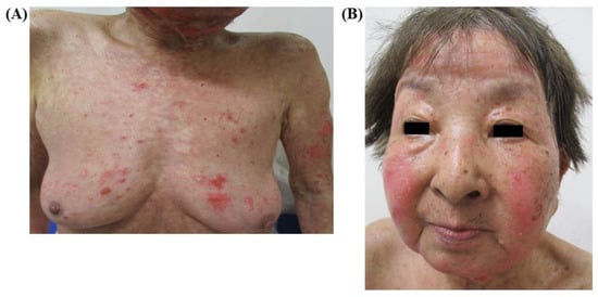 Diffuse erythema on the trunk (A) as well as erosion and blisters on the face (B) greatly improved 10 days after intravenous immunoglobulin therapy. The patient selected best supportive care thereafter, since the response was maintained after the cessation of osimertinib.
