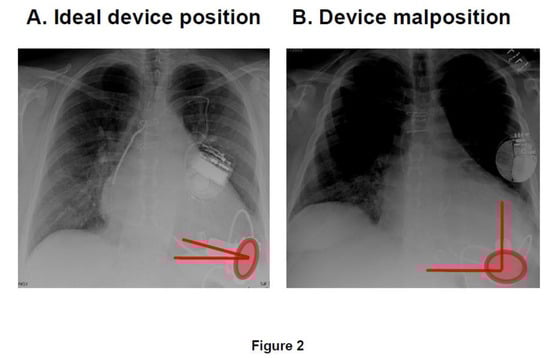 CardioMEMS was originally developed to monitor pulmonary artery pressures in patients with chronic heart failure using a sensor percutaneously implanted in the main pulmonary artery (Figure 6) []. Its use is increasing in routine heart failure care, given the reduced risk of heart failure hospitalizations in patients with CardioMEMS-guided therapy as shown in prior randomized clinical trials []. The device allows the clinician to remotely monitor pulmonary artery pressures, continuously allowing for precise titration of medical therapies. Pulmonary artery pressures often become abnormal before clinical symptomology develops in patients with chronic heart failure. Thus, risk of heart failure hospitalization reduction in those with the device is likely based on the adjustment of medical therapies before the development of symptomatic congestion.