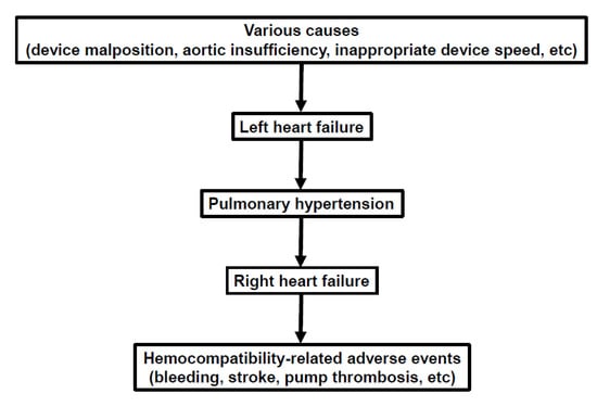 Elevated central venous pressures in the setting of normal pulmonary capillary wedge pressure are one of the hallmarks of right heart failure and tend to be difficult to correct alone through mechanical unloading []. Right heart failure is also associated with above-discussed hemocompatibility-related adverse events including bleeding and systemic thromboembolism (Figure 3) [].