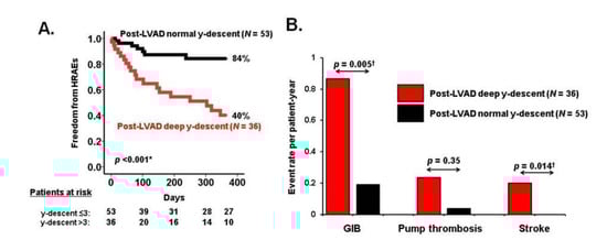 Impacts of y-descent on hemocompatibility-related adverse events during left ventricular assist device (LVAD) support (reused with permission []). * p <0.05 by log-rank test. † p <0.05 by Mann–Whitney U test. HRAE, hemocompatibility-related adverse events; GIB, gastrointestinal bleeding. A deep y-descent was defined as y-descent depth >3 mmHg from the mean right atrial pressure. A deep y-descent following LVAD implantation was associated with lower freedom from HRAEs, predominantly due to GIB and stroke.