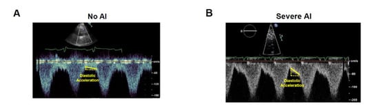 - Grinstein, J.; Kruse, E.; Sayer, G.; Fedson, S.; Kim, G.H.; Jorde, U.P.; Juricek, C.; Ota, T.; Jeevanandam, V.; Lang, R.M.; et al. Accurate quantification methods for aortic insufficiency severity in patients with LVAD: Role of diastolic flow acceleration and systolic-to-diastolic peak velocity ratio of outflow cannula. JACC Cardiovasc. Imaging 2016, 9, 641–651. [Google Scholar] [CrossRef] [PubMed]