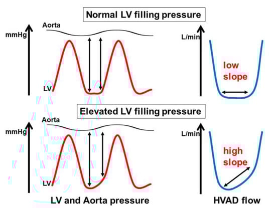 The HeartWare LVAD provides an estimated instantaneous flow waveform that shows insights into patients and device properties. For example, low pulsatility and low mean flow indicate hypovolemia, whereas low pulsatility and high mean flow let us detect suspected device thrombosis. High pulsatility and low mean flow might indicate continuous suction, whereas high pulsatility and high mean flow indicate volume overload. LVAD flow is determined by the pressure difference between the aorta and left ventricle at a fixed device speed. When aortic pressure is assumed to be constant at the diastole phase, LVAD flow is dependent on left ventricular pressure. When left ventricular pressure increases, LVAD flow often increases. Given this mechanism, pulmonary capillary wedge pressure can be estimated by the slope of LVAD flow at the end-diastolic phase (Figure 7) []. We showed that the estimated elevated pulmonary capillary wedge pressure calculated from LVAD flow slope was associated with higher heart failure readmission rates [].