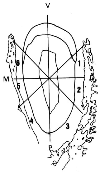 The histomorphometric evaluation of the root surface was performed according to the modified method described by Andreasen [32]. A grid consisting of four lines intersecting each other was positioned over the cross-sectioned incisor root photomicrograph. The center of the grid superimposed the geometric center of the pulp cavity, and the vertical line superimposed the greatest buccal-lingual diameter of the root. In this manner, histological changes in the supporting periodontium could be evaluated through the intersections of the four lines with the root surface. A blinded observer performed the histological and histomorphometric evaluation (Figure 2).