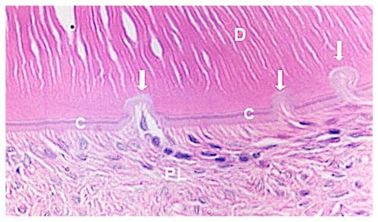 Photomicrographic of the repaired area of the periodontal ligament. Arrows indicate inactive resorption lacunae with neoformation of cement; C-cement; D-dentin; PL-periodontal ligament. Magnification: 40X; Stain: HE. HE: Hematoxilin and Eosin.