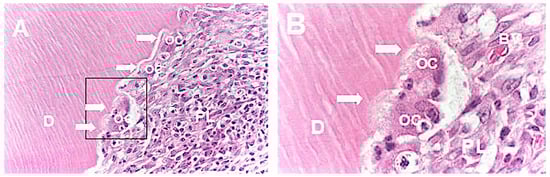 Photomicrographs of tooth presenting root resorption. (A) Inflammatory infiltrate in the periodontal ligament and inflammatory resorption with osteoblasts in the Howship’s lacunae. Arrows indicate active resorption lacunae (HE–40X). (B) Active osteoblasts in detail. Arrows indicate ruffled border (HE–100X). OC-osteoclasts; D-dentine; PL-periodontal ligament; BV-blood vessel.
