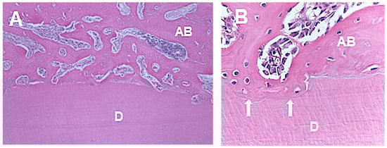 Photomicrograph of tooth presenting ankylosis. (A) ample view of ankylosis (HE–40X). (B) replacement resorption in detail with bone tissue formation (HE–100X). AB-alveolar bone; D-dentine.