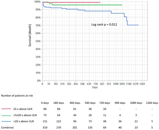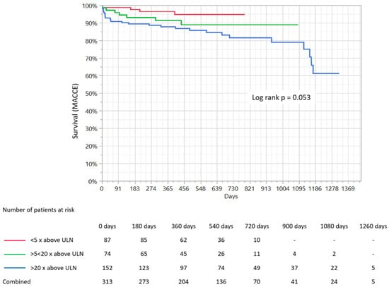 | Concentration of High-Sensitivity Cardiac I Troponin (Increase—Times above the Upper Normal Limit) | p-Value | |||