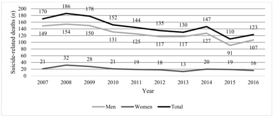 Table 2 shows the unadjusted suicide mortality rates (per 100,000 population) for the study period. During the 2007–2016 decade, the overall unadjusted suicide mortality rates showed a significant trend to decline over time (r = −0.78; p = 0.007) and ranged from 3.1 in 2015 to 4.7 in 2008. For males, crude suicide mortality rates ranged from 4.6 in 2015 to 8.7 in 2008, while for females, these values were between 0.7 in 2013 and 1.8 in 2008.