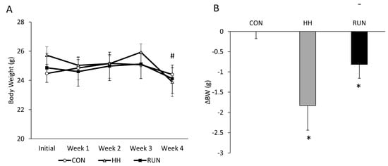 Changes in total body weight over four weeks in models of muscle gain and loss. (A) Body weight over four weeks was similar in Control (CON), hypobaric hypoxia (HH), and wheel running (RUN) mice. (B) Delta body weight (g) was significant in HH and RUN, with mice losing on average two and one gram, respectively. Serial changes in body weight progression were assessed by one-way repeated measures ANOVA and delta body weight by one-sided t-test compared to 0. Data are expressed as mean ± SEM. # p < 0.05 compared to Initial within RUN and HH. * p < 0.05 compared to 0. n = 6 CON, n = 6 RUN, n = 9 HH.