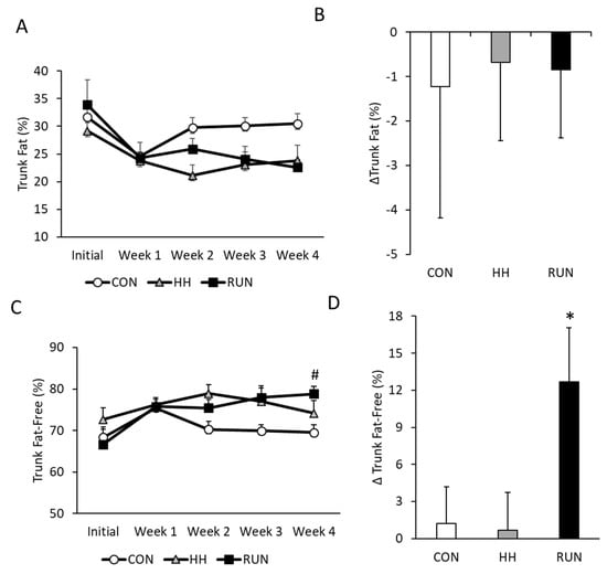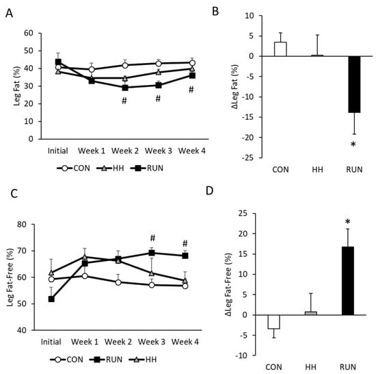 In the leg, composition was approximately 40% fat and 60% fat-free mass (Figure 3A,C) in all three groups at baseline. Leg composition shifted with RUN, so that by the end of four weeks, fat-mass decreased and fat-free mass increased (Figure 3B,D). No changes in leg composition were noted in CON or HH conditions.
