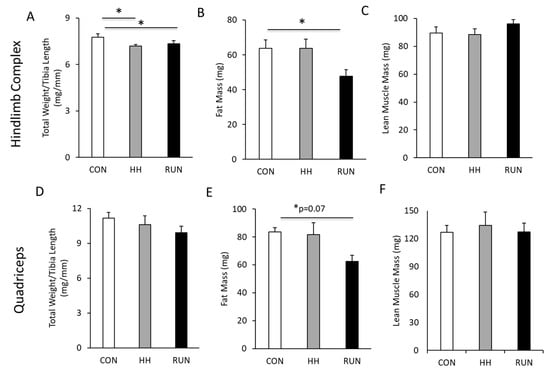 At the end of four weeks, we dissected and carefully weighed the HLC and Quad. Total HLC and Quad mass were normalized to tibia length to account for animal size, not animal mass, given the significant changes in BW over four weeks. Total normalized HLC mass was significantly lower in HH and RUN compared to CON (Figure 4A). This loss of HLC mass in the RUN group was due to decreased fat mass (Figure 4B) with unchanged lean muscle mass (Figure 4C). Quad total mass normalized to tibia length was unchanged in HH or RUN (Figure 4D), with lower quad fat mass (Figure 4E) and no changes in lean quad mass (Figure 4F).
