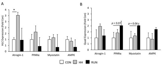 To assess the molecular mediators of muscle hypertrophy and atrophy, we quantified the expression of atrogin-1, myostatin, AMPK, and PPARα by qRT-PCR in the HLC and Quad. In the HLC, atrogin-1 expression was significantly upregulated in response to HH (Figure 5A), with no changes in expression observed in the other mediators of muscle mass. In the Quad, PPARα and myostatin tended to be higher in RUN than CON (Figure 5B).