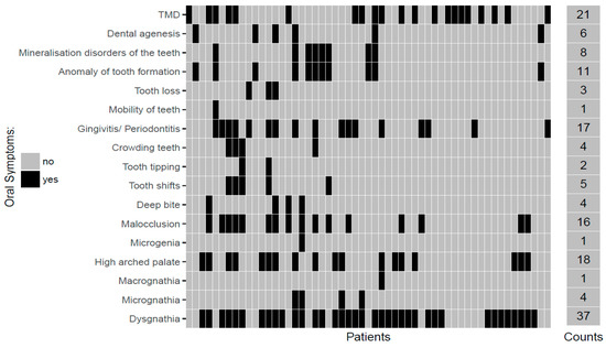 When asked about oral conditions, 79 participants provided responses, 55 (69.6%) of which described oral conditions. Thirty-seven respondents cited oral conditions as various forms of skeletal malocclusion and growth aberrations (e.g., high palate, micrognathia, macrognathia, microgenia or ‘jaws do not fit together’), while a high palate was explicitly mentioned by 18 respondents. Tooth-related dysgnathia (malocclusions) were also described by 16 participants. There were also combined forms of skeletal and dentoalveolar dysgnathia among the respondents. Craniomandibular dysfunctions occurred in 21 of the respondents, according to the data. Gingivitis/periodontitis was also mentioned as oral conditions by 17 respondents, shape abnormalities of the teeth were described by 11 respondents, and a decrease in the number of teeth (hypodontia/oligodontia) was described by a total of 6 respondents. Figure 1 provides an overview of the conditions described by the respondents.