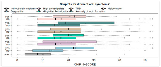 Figure 2. Boxplots of OHIP-14 score for different oral conditions.