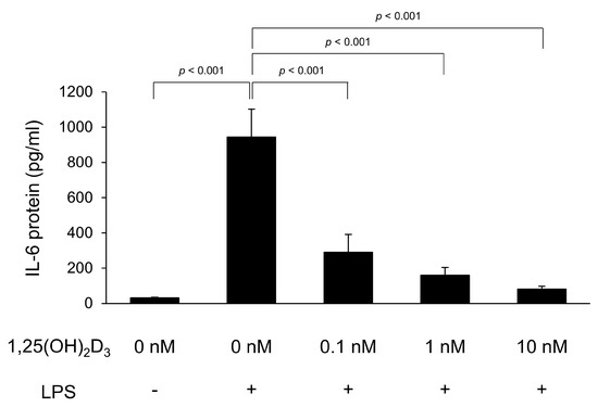 To verify the protein production of proinflammatory cytokines, IL-6 and TNFα protein concentrations in the culture supernatant of C2C12 myotubes were measured by ELISA. The IL-6 protein concentration is shown in Figure 1. LPS significantly increased IL-6 protein levels (944 ± 158 pg/mL) in the culture supernatant compared to in the culture supernatant without LPS stimulation (31 ± 2 pg/mL, p < 0.001). However, the IL-6 concentration was significantly low in C2C12 myotubes with 0.1, 1, and 10 ng/mg of 1,25(OH)2D3 treatment (IL-6 concentration; 289 ± 101, 160 ± 45, and 81 ± 17 pg/mL, respectively) compared to that in untreated C2C12 myotubes (p < 0.001). Unfortunately, we did not compare the TNFα protein levels because they were below the limit of detection of our assay (31.3 pg/mL) in many supernatant samples.