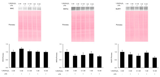The protein expression levels of MHC, MuRF1, and MAFbx were measured by Western blotting. After LPS treatment, the cells were washed three times with phosphate-buffered saline and then lysed and homogenized by ultrasound in 20 mM Tris-HCl buffer, pH 7.6, containing 150 mM KCl, 1% TritonX-100, and cOmplete™ protease inhibitor cocktail (Roche Diagnostics, Basel, Switzerland). The extracts were centrifuged at 12,000× g for 10 min at 4 °C, and aliquots of the supernatants were used for Western blot analyses. EzApply (ATTO, Tokyo, Japan) was added to the aliquots, and the samples were boiled for 5 min. The proteins in the samples were separated on a 5–20% gradient polyacrylamide gel (ATTO) by electrophoresis and transferred to polyvinylidene fluoride membranes (ATTO) by the semi-dry blotting method. The membranes were stained with Ponceau-S staining solution (Beacle, Inc., Kyoto, Japan), blocked with EzBlock Chemi (ATTO) for 1 h at room temperature, and incubated with primary antibodies for 1 h at 37 °C. The antibodies used were anti-myosin heavy chain (1:5000; NB300-284; Novus Biologicals, Littleton, CO, USA), anti-MAFbx (1:5000; sc-33782; Santa Cruz Biotechnology, Dallas, TX, USA), and anti-MuRF1 (1:5000; sc-27642; Santa Cruz Biotechnology, Dallas, TX, USA). Following incubation with the primary antibodies, the membranes were washed three times (10 min/wash) in EzWash (ATTO) containing 0.1% Tween 20 and incubated with the secondary antibodies for 1 h at room temperature. The secondary antibodies used were anti-mouse IgG (1:25,000; Nacalai Tesque, Kyoto, Japan) for myosin heavy chain, anti-rabbit IgG (1:25,000; Nacalai Tesque, Kyoto, Japan) for MAFbx, and anti-goat IgG (1:50,000; Abcam, Cambridge, UK) for MuRF1. The membranes were washed three times (10 min/wash) in EzWash containing 0.1% Tween 20 and reacted with ECL Prime Western Blot Detection Reagent (GE Healthcare, Buckinghamshire, UK) for 5 min at room temperature. The protein bands were detected using a LumiCube (Liponics, Inc., Tokyo, Japan) and analyzed using ImageJ software (NIH, Bethesda, MD, USA). The bands from the Ponceau-stained membranes were used as protein loading controls. The data were normalized to the value of the myotubes without treatment with both 1,25(OH)2D3 and LPS.