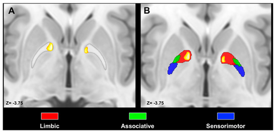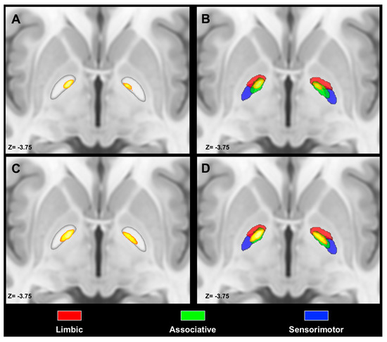 - Draganski, B.; Kherif, F.; Klöppel, S.; Cook, P.A.; Alexander, D.C.; Parker, G.J.M.; Deichmann, R.; Ashburner, J.; Frackowiak, R.S.J. Evidence for segregated and integrative connectivity patterns in the human Basal Ganglia. J. Neurosci. 2008, 28, 7143–7152. [Google Scholar] [CrossRef] [PubMed]