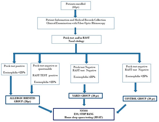 The patients were sub-classified according to their rhinology diagnosis into three homogeneous groups of 20 patients: (1) the NARES group, (2) the AR group, and (3) control group (healthy patients without rhinitis).