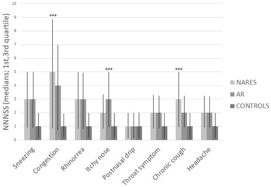 Figure 2 reports the NNNSS values for the three groups. These values are expressed as a median with first and third quartile. Nasal congestion and chronic cough were found to be prevalent symptoms in the group of NARES, whereas nasal itch prevailed in the group with AR. The comparison between NARES vs. AR scores showed that median values for the various symptoms were the following (Table 2): 5 vs. 4 for nasal congestion, p = 0.001; 3 vs. 2 for chronic cough (p = 0.001) and 2 vs. 3 (p = 0.001) for nasal itch. The comparison with the control group was statistically significant for all symptoms (p < 0.0005) with the exclusion of postnasal drip.