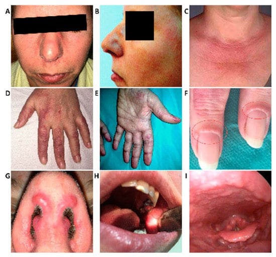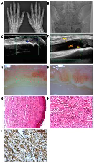 - Niklas, K.; Niklas, A.; Puszczewicz, M. Multicentric reticulohistiocytosisin the course of undifferentiated connective tissue disease. Postepy Dermatol. Alergol. 2019, 36, 646–647. [Google Scholar] [CrossRef]