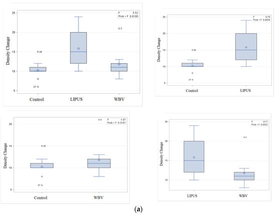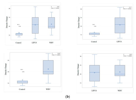 The results of this study obtained at 1 month revealed that the application of LIPUS increased the bone density compared with the control group. No significant difference was noted between the WBV group with the LIPUS (p value = 0.056) or the control (p value = 0.316) group. The process of bone healing has three phases. The first phase includes coagulation and inflammation, and occurs in the first week, postoperatively. Angiogenesis and proliferation occur in the second phase. Evidence shows that LIPUS may have the highest efficacy in this phase [16,17] Finally, woven bone forms following the formation of primary connective tissue. This phase is an important step in the intramembranous ossification of maxillofacial bones. LIPUS may also be effective in this phase [18].