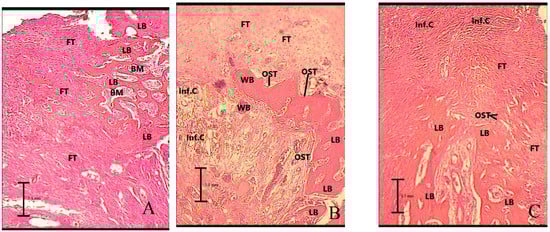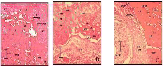 Histologic findings of mandibular bone defect in groups 2 months after surgery with magnification of ×100. (A) Control (the mandibular bone defect was mainly replaced by lamellar bone), (B) low-intensity pulsed ultrasound (the mandibular bone defect was mainly replaced by lamellar and woven bone), (C) whole-body vibration (the mandibular bone defect was mainly replaced by lamellar bone). LB: lamellar bone, WB: woven bone, FT: fibrosis or connective tissue, Inf.C: inflammatory cells, BM: bone marrow, OST: osteoblast.