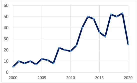 Number of scientific articles published per year (between 2000 and 2020) on the topic of Eagle´s syndrome or syndrome of elongated styloid process based on https://pubmed.ncbi.nlm.nih.gov/search results (National Center for Biotechnology Information, U.S. National Library of Medicine, on 7 June, 2020).