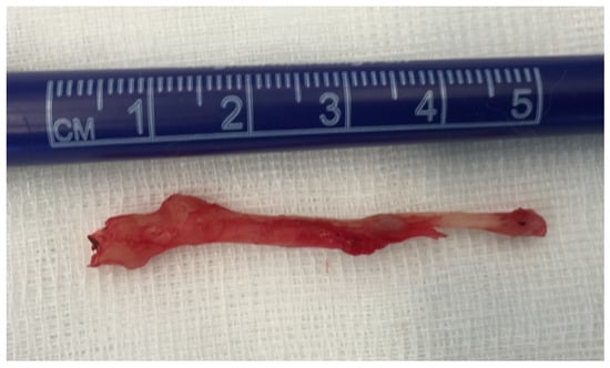 All five patients underwent resection of the styloid process from retromandibular approach; total of nine styloid processes were resected (length 4.8–7.2 cm; Figure 5). Postoperatively, four patients had immediate resolution of symptoms following their awakening in the recovery unit; one patient reported clinical improvement after 10 days. Patients were discharged from the hospital 3–5 days after the surgery, and had an uneventful post-operative course with minimal postoperative pain and swelling. Presently, 6 months after the surgery, all five patients are asymptomatic with minimal scarring and no peripheral neurological deficit.