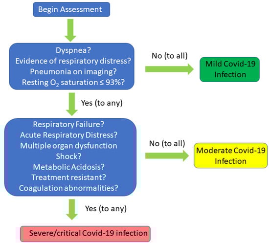 Covid-19 severity levels can be categorized as mild, moderate, severe, and critical conditions (Figure 1) [,]. Mild disease is defined as patients without dyspnea, without clinical evidence of respiratory distress, no pneumonia on imaging, and blood oxygen saturation maintained above 93% under resting conditions [,]. Fever (<39.1 °C) and cough are seen frequently, even in mild disease. Moderate disease is diagnosed by fever or respiratory symptoms with pneumonia while severe disease manifests as dyspnea and/or hypoxemia. There is respiratory distress with respiratory rate ≥ 30 breaths/min; SpO2 ≤ 93% at rest, and PaO2/FIO2 ≤ 300 []. The most critical patients develop acute respiratory distress syndrome (ARDS) with respiratory failure in need of mechanical ventilation, multiple organ dysfunction (MODS) and/or shock, metabolic acidosis, and coagulation abnormalities that are resistant to treatment [,].