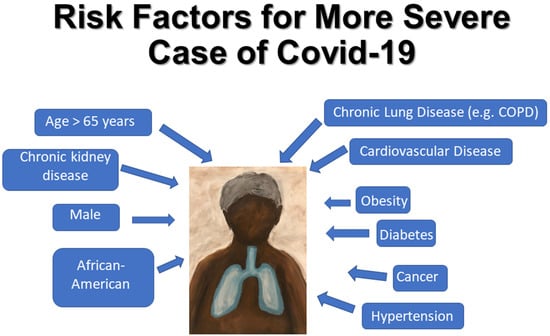 Preexisting conditions such as diabetes mellitus, cardiovascular disease, hypertension and obesity also increase the risk of death [,,,]. Diabetes and cardiovascular disease are found disproportionately in severe cases of Covid-19 requiring ICU admission [,,,]. Obesity may compromise ventilation at the lung bases and can be considered a state of low grade inflammation and both these factors may contribute to risk of severe Covid-19 infection and greater need for mechanical ventilation in obese patients, especially in patients under age 65 [,]. Chronic lung disease and pre-existing chronic obstructive pulmonary disease (COPD) increase the likelihood of developing severe Covid-19 [,,]. A history of cancer is associated with higher incidence of Covid-19 infection along with elevated risk of severe-associated events [,,].
