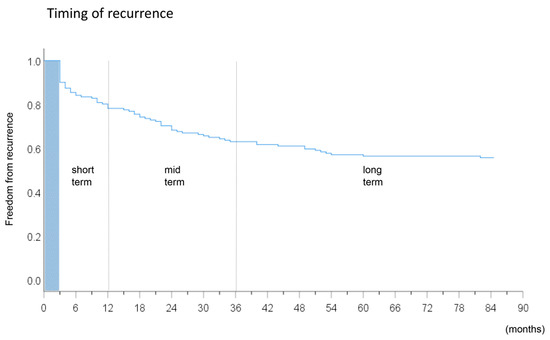 Kaplan–Meier curve revealing the timing of recurrences of atrial fibrillation in all study subjects after the index procedure.