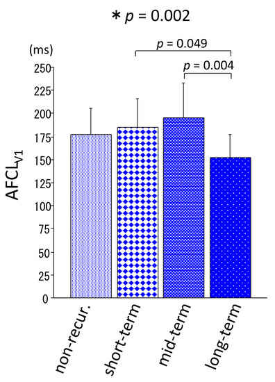 Atrial fibrillation cycle length in lead V1 (AFCLV1) measurement before ablation in the non-recurrence and short-term, mid-term, and long-term recurrence groups. The bars indicate mean and SD. * ANOVA. AFCLV1 atrial fibrillation cycle length in lead V1.
