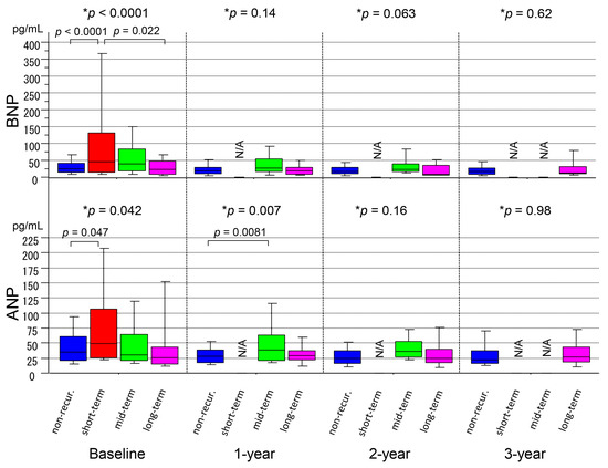 The BNP level at baseline was significantly higher in the short-term recurrence group than that in the non-recurrence group or long-term recurrence group (p < 0.0001), whereas those at the 1-year, 2-year, and 3-year follow-ups did not show significant differences between the groups (p = 0.14, p = 0.063, and p = 0.62, respectively) (Figure 4 and Table 2). It was noted that the BNP level in the long-term recurrence group was low throughout the follow-up period, as was that in the non-recurrence group. The ANP level showed a similar trend as the BNP level. However, that at 1 year also revealed a statistically significant difference between the groups (p = 0.007) (Figure 4 and Table 2).