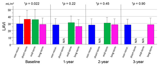 Serial measurements of the left atrial volume indexed (LAVi) for 3 years after ablation in the non-recurrence and short-term, mid-term, and long-term recurrence groups. † ANOVA. LAVi left atrial volume (indexed), N/A not available.