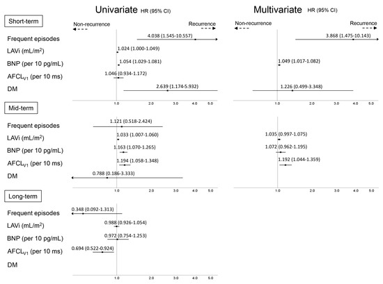 Cox regression analyses were performed separately for the three follow-up phases (Figure 6). During the short-term period, diabetes mellitus, frequent AF episodes (≥1 per week), and the BNP level at baseline were the predictors of AF recurrence in the univariate analysis (hazard ratio 2.639 (95% confidence interval 1.174–5.932), p = 0.019; 4.038 (1.545–10.557), p = 0.004; and 1.054 (1.029–1.081), p <0.0001, respectively), and frequent AF episodes and BNP level were the independent predictors in the multivariate analysis (3.868 (1.475–10.143), p = 0.006 and 1.049 (1.017–1.082), p = 0.002, respectively). During the mid-term period, LAVi, BNP level, and AFCLV1 were the predictors of AF recurrence in the univariate analysis (1.033 (1.007–1.060), p = 0.013; 1.163 (1.070–1.265), p = 0.0004; and 1.194 (1.058–1.348), p = 0.004, respectively), and the independent predictor of AF recurrence in the multivariate analysis was longer AFCLV1 (1.192 (1.044–1.359), p = 0.0091). During the long-term period, a shorter AFCLV1 (0.694 (0.522–0.924), p = 0.012) was the only predictor of AF recurrence in the univariate analysis (Figure 6).