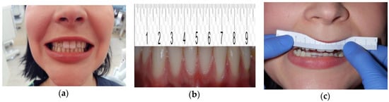 Lateral movements can be examined using the same method, by placing the ruler on the upper incisors. The midline between mandibular central incisors should overlap with the position number 5 on the ruler (Figure 4a–c). The range of lateral movements can be determined by moving the mandible to the left and right against that reference point. The patient should be instructed to move the mandible only in the lateral plane instead of moving the mandible anteriorly and laterally, which is frequently a mistake [,,,].