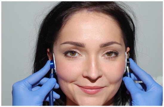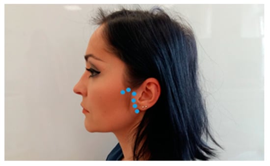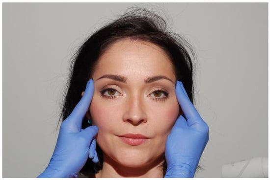 A clinical examination of temporomandibular joint consists of palpation and auscultation. Palpation is performed simultaneously on both sides of the face (Figure 6) by exerting the force of around 400 g per an area of a square centimeter (for superficial muscles) and around 1800 g per an area of a square centimeter (for deep muscles). Auscultation is performed with the double-tube stethoscope (Figure 7). The individual palpation force can be measured using electronic kitchen scales. If too much pressure is applied during an examination, the diagnostic results can be unreliable []. It is also vital to compare information about spontaneous pain in the temporomandibular joints (other than the pain caused by mandibular movements) obtained during the medical interview. There are various definitions of palpation. The term “palpation” was coined from the Latin word palpatio, which means “to touch”. However, palpation has many different meanings and defining palpation as using the sense of touch to examine a patient is too simplistic. Apart from using one’s hands to examine the body, physicians obtain valuable information by noticing how patients sense and react to palpation. The primary aim is to locate a proper area of the body to examine this structure and the patient’s reaction to palpation pressure. Both TMJ should be examined simultaneously, using fingertips, by touching the joints and the adjacent area at 5 to 6 points spaced approximately 0.5 cm apart. The examination should be repeated three times: in the position of centric occlusion, at around 15 mm disclusion, and in maximum mandibular depression. Pain sensation during mandible movements in the area surrounding the TMJ is also checked. The examination area covers the lateral surface of the poles of mandibular processes, retrodiscal area, and the area located anteriorly from the mandibular condyle, under the articular tubercle of the temporal bone (Figure 8). The examined patient’s head should be placed on a headrest. During palpation, the examining physician should pay attention to possible deformations or structural abnormalities in the temporomandibular joint (deformed bones, elevations, recesses). Palpation of temporomandibular joints from the side of the ear canals has a much lower diagnostic value as compared to examination of the lateral surface of the joints. Pain on palpation may be indicative of functional disorders in the masticatory apparatus and inflammatory conditions of periarticular and articular tissues [,,,,,,,,,,,].