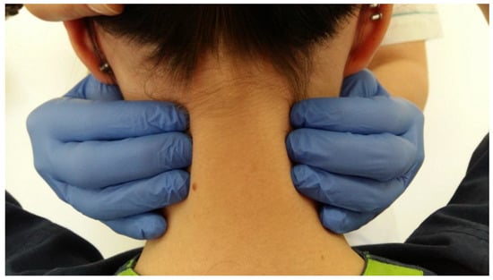 Posterior muscles of the neck (trapezius, splenius cervicis, levator scapulae) should also be examined by palpation from the upper attachments in the downward direction (Figure 13). These muscles are not directly involved in mandibular movements but can be a source of pain and pulsating sensation in the masticatory apparatus. The study of mandibular lifting muscles is shown in the figure using indirect tests (Figure 14a,b).