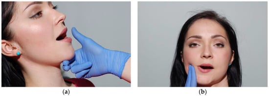 Clinical examination starts with palpation and visual assessment of the shape, size, structure, and function of the muscles. In physiological conditions, tenderness and/or pain on palpation are absent as long as proper palpation force is applied during the examination. Functional disorders of masticatory muscles are most commonly caused by excessive strain observed during electrophysiological analysis, both during rest and at maximum contraction. The chronic increased strain of the muscles may lead to impaired blood flow and the resulting reduced supply of oxygen and nutrients, as well as accumulation of allogeneic substrates responsible for pain sensations. Pain originates from mandibular movements and can be spontaneous in more advanced dysfunctions. Palpation pain is caused by flexible deformations of the examined muscle and shows signs of functional disorders. Palpation pressure of around 400 g should be applied with two or three fingers for no more than several seconds. Superficial muscles of mastication should be first examined simultaneously on both sides of the face (Figure 9a) in the area of upper and lower muscle attachment and in the largest cross-section area. The deep masseter area should be examined with one fingertip, around 1 cm anteriorly from the area of the temporomandibular joint (Figure 9b) [,].
