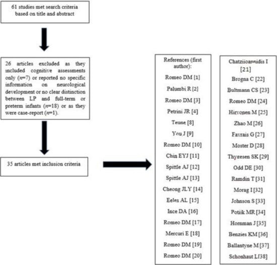 A total of 61 studies were initially identified; of them, 26 were excluded as they included cognitive assessments only (n = 7) or reported no specific information on neurological development or no clear distinction between LP and full-term or preterm infants (n = 18) or as they were case-reports (n = 1). The remaining 35 articles, comprising a total of 301,495 children, met the inclusion criteria after a review of the full text including the neurological assessments in LP infants (Figure 1).