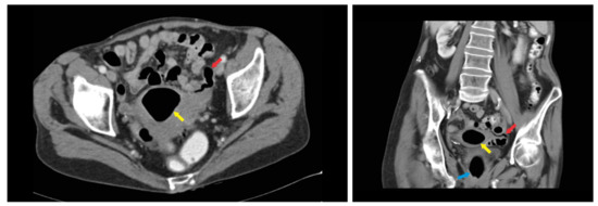 - Panghaal, V.S.; Chernyak, V.; Patlas, M.; Rozenblit, A.M. CT features of adnexal involvement in patients with diverticulitis. Am. J. Roentgenol. 2009, 192, 963–966. [Google Scholar] [CrossRef] [PubMed]
