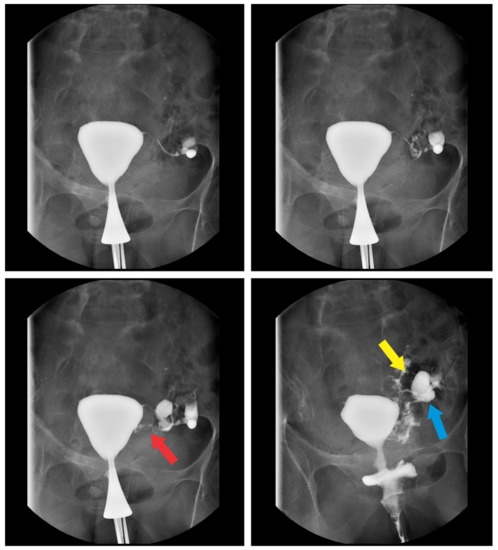 Hysterosalpingography: (red arrow)—tubal lumen; (blue arrow)—intestinal lumen; (yellow arrow)—tubal fistula.