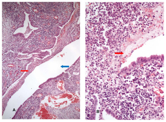 Microscopic examination: (A) H&E slide ×5 magnification. Chronic and subacute salpingitis (red arrow; tubal lumen—blue arrow). (B) H&E slide ×10 magnification. Stercoral debris mixed with extensive abscessation beaches (red arrow).