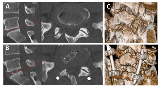 Figure 4. Preoperative and postoperative CT images. (A) Preoperative sagittal (left) and axial (right) CT findings of L5/S1 FELIF (Case No. 5, a 47-year-old man). (B) Postoperative sagittal (left) and axial (right) CT findings. The red lines in the sagittal images indicate the level of axial scanning. Note that the disc height increased after FELIF. (C,D) Preoperative (C) and postoperative (D) 3-dimensional CT findings. Note that an appropriate extent of the SAP was removed for cage insertion. CT = computed tomography; FELIF = full-endoscopic lumbar interbody fusion; SAP = superior articular process.