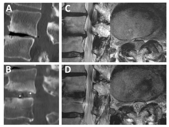 Figure 5. Preoperative and postoperative CT and MRI scans. (A,B) Preoperative (A) and postoperative (B) sagittal CT findings of L3/4 FELIF (Case No. 6, a 74-year-old man). (C) Preoperative sagittal (left) and axial (right) MRI findings. (D) Postoperative sagittal (left) and axial (right) MRI findings. Note that cauda equina can be observed separately after FELIF (D, right). CT = computed tomography; FELIF = full-endoscopic lumbar interbody fusion; MRI = magnetic resonance imaging.