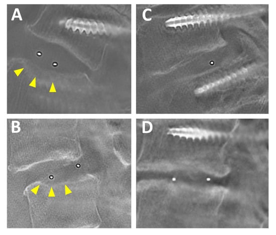 Figure 6. Preoperative tomographic roentgenography. (A) Case No. 1, an 83-year-old woman. (B) Case No. 2, a 64-year-old woman. (C) Case No. 3, an 84-year-old woman. (D) Case No. 3, a 75-year-old woman. Note that no lucency is present at the top and bottom of the cage. Slight cage subsidence was observed in Case No. 1 and 2 (arrow heads).