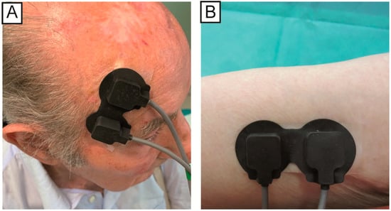 The position of the NIRS emission probe and detection probe on the skin influences the depth of the analyzed area and consequently the zone of the body that will be evaluated. For this study, the two probes were placed at a distance of 2.5 cm from each other, so that the path was close to the skin and would not penetrate too deep. In the case of AK, the probes were placed so that the lesion was positioned exactly between the two probes. For the healthy skin area, the probes were positioned on the underside of the arm (while relaxed). After the treatment, the probes were placed on the same area of the AKs acquisition before the therapy (the correct position is displayed in the photos taken before the treatment, Figure 1). The signals were acquired with the same acquisition protocol as in our previous study [], at least 14 days after stopping the treatment. Briefly, the NIRS signals were acquired over three specific moments: baseline (1.5 min), application of an ice pack near probes as a vasoconstriction stimulus (1.5 min), removal of ice pack and acquisition of vascular recovery (1.5 min).